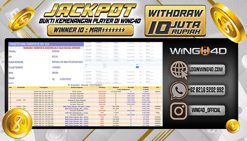 Bukti berikut merupakan salah satu komitmen WING4D untuk melayani seluruh member setia WING4D secara sungguh-sungguh, Dengan membayar Lunas seluruh kemenangan member secara Cepat, Tepat dan Akurat. Selamat kepada Bpk. MARJAN yang akhirnya mendapatkan jackpot besar dalam Permainan Slot : Pragmatic Play di situs bandar togel terpercaya WING4D. Dalam WITHDRAW sebesar Rp. 10,000,000,- di bayar dengan lunas dan prosesnya di lakukan secara cepat oleh pihak WING4D. Dengan bukti yang kami berikan sudah seharusnya menjadi hal yang bisa anda semua bayangkan betapa aman dan nyamannya pelayanan yang di berikan WING4Dkepada para membernya. Tentunya jika anda masih bingung mencari situs bandar togel online terpercaya, anda bisa segera melakukan pendaftaran dan bermain di situs togel online terpercaya dan terbukti membayar semua kemenangan jumlah berapapun seperti situs WING4D!. Gabung dengan WING4D banyak PROMO BONUSNYA Dapatkan promo bonus menarik dari WING4D yaitu :