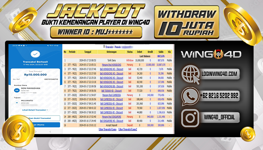 Selamat kepada Bpk. MUJIANTO yang akhirnya mendapatkan jackpot besar dalam PASARAN TOGEL HONGKONG di situs bandar togel terpercaya WING4D. Dalam WITHDRAW sebesar Rp. 10,000,000,- di bayar dengan lunas dan prosesnya di lakukan secara cepat oleh pihak WING4D. Dengan bukti yang kami berikan sudah seharusnya menjadi hal yang bisa anda semua bayangkan betapa aman dan nyamannya pelayanan yang di berikan WING4Dkepada para membernya. Tentunya jika anda masih bingung mencari situs bandar togel online terpercaya, anda bisa segera melakukan pendaftaran dan bermain di situs togel online terpercaya dan terbukti membayar semua kemenangan jumlah berapapun seperti situs WING4D!.