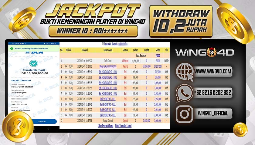 Selamat kepada Bpk.ADIB FURQON yang akhirnya mendapatkan jackpot besar dalam PASARAN TOGEL HONGKONG di situs bandar togel terpercaya WING4D. Dalam WITHDRAW sebesar Rp. 10,200,000,- di bayar dengan lunas dan prosesnya di lakukan secara cepat oleh pihak WING4D. Dengan bukti yang kami berikan sudah seharusnya menjadi hal yang bisa anda semua bayangkan betapa aman dan nyamannya pelayanan yang di berikan WING4Dkepada para membernya. Tentunya jika anda masih bingung mencari situs bandar togel online terpercaya, anda bisa segera melakukan pendaftaran dan bermain di situs togel online terpercaya dan terbukti membayar semua kemenangan jumlah berapapun seperti situs WING4D!.