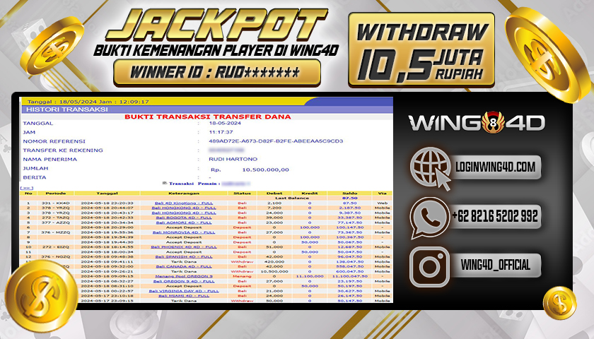 Selamat kepada Bpk. RUDI HARTONO yang akhirnya mendapatkan jackpot besar dalam PASARAN TOGEL OREGON 9 di situs bandar togel terpercaya WING4D. Dalam WITHDRAW sebesar Rp. 10,500,000,- di bayar dengan lunas dan prosesnya di lakukan secara cepat oleh pihak WING4D. Dengan bukti yang kami berikan sudah seharusnya menjadi hal yang bisa anda semua bayangkan betapa aman dan nyamannya pelayanan yang di berikan WING4Dkepada para membernya. Tentunya jika anda masih bingung mencari situs bandar togel online terpercaya, anda bisa segera melakukan pendaftaran dan bermain di situs togel online terpercaya dan terbukti membayar semua kemenangan jumlah berapapun seperti situs WING4D!.