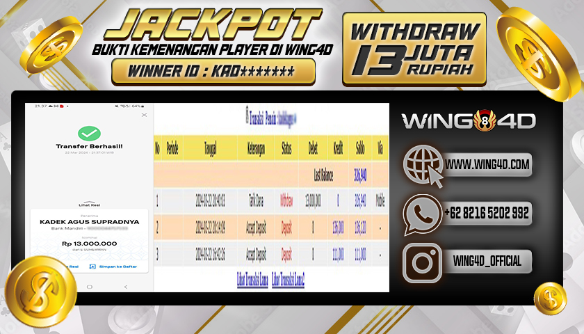 Selamat kepada Bpk. KADEK AGUS SUPRADNYA yang akhirnya mendapatkan jackpot besar dalam Permainan Slot : Gates Of Olympus di situs bandar togel terpercaya WING4D. Dalam WITHDRAW sebesar Rp. 13,000,000,- di bayar dengan lunas dan prosesnya di lakukan secara cepat oleh pihak WING4D. Dengan bukti yang kami berikan sudah seharusnya menjadi hal yang bisa anda semua bayangkan betapa aman dan nyamannya pelayanan yang di berikan WING4Dkepada para membernya. Tentunya jika anda masih bingung mencari situs bandar togel online terpercaya, anda bisa segera melakukan pendaftaran dan bermain di situs togel online terpercaya dan terbukti membayar semua kemenangan jumlah berapapun seperti situs WING4D!.