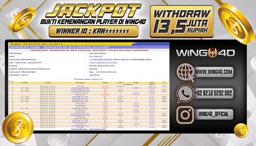 Bukti berikut merupakan salah satu komitmen WING4D untuk melayani seluruh member setia WING4D secara sungguh-sungguh, Dengan membayar Lunas seluruh kemenangan member secara Cepat, Tepat dan Akurat.