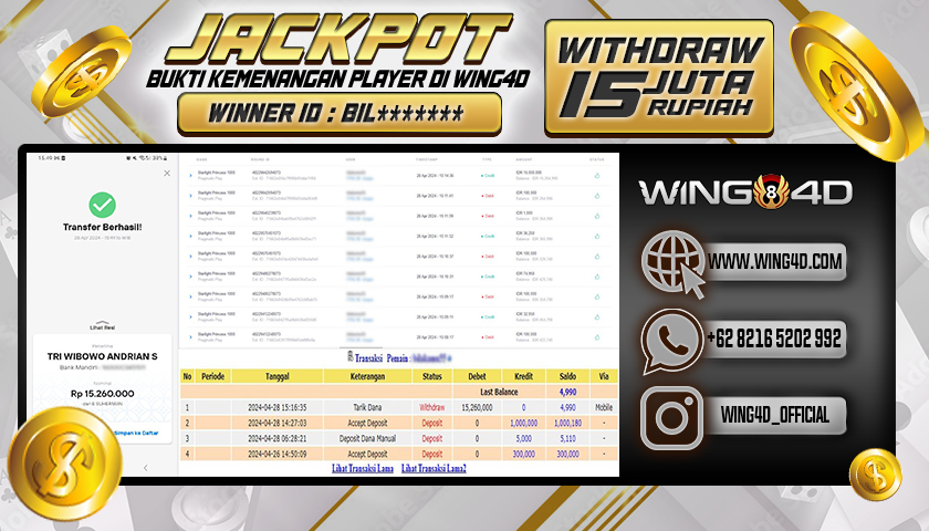 Bukti berikut merupakan salah satu komitmen WING4D untuk melayani seluruh member setia WING4D secara sungguh-sungguh, Dengan membayar Lunas seluruh kemenangan member secara Cepat, Tepat dan Akurat. Selamat kepada Bpk. TRI WIBOWO ANDRIAN S yang akhirnya mendapatkan jackpot besar dalam Permainan Slot : Starlight Princess 1000 di situs bandar togel terpercaya WING4D. Dalam WITHDRAW sebesar Rp. 15,000,000,- di bayar dengan lunas dan prosesnya di lakukan secara cepat oleh pihak WING4D. Dengan bukti yang kami berikan sudah seharusnya menjadi hal yang bisa anda semua bayangkan betapa aman dan nyamannya pelayanan yang di berikan WING4Dkepada para membernya. Tentunya jika anda masih bingung mencari situs bandar togel online terpercaya, anda bisa segera melakukan pendaftaran dan bermain di situs togel online terpercaya dan terbukti membayar semua kemenangan jumlah berapapun seperti situs WING4D!. Gabung dengan WING4D banyak PROMO BONUSNYA Dapatkan promo bonus menarik dari WING4D yaitu :