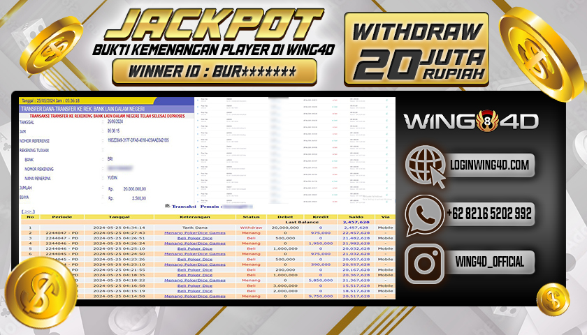 Selamat kepada Bpk. YUDIN yang akhirnya mendapatkan jackpot besar dalam PokerDice Games User di situs bandar togel terpercaya WING4D. Dalam WITHDRAW sebesar Rp. 20,000,000,- di bayar dengan lunas dan prosesnya di lakukan secara cepat oleh pihak WING4D. Dengan bukti yang kami berikan sudah seharusnya menjadi hal yang bisa anda semua bayangkan betapa aman dan nyamannya pelayanan yang di berikan WING4Dkepada para membernya. Tentunya jika anda masih bingung mencari situs bandar togel online terpercaya, anda bisa segera melakukan pendaftaran dan bermain di situs togel online terpercaya dan terbukti membayar semua kemenangan jumlah berapapun seperti situs WING4D!.