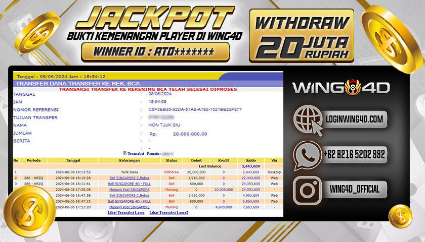 Bukti berikut merupakan salah satu komitmen WING4D untuk melayani seluruh member setia WING4D secara sungguh-sungguh, Dengan membayar Lunas seluruh kemenangan member secara Cepat, Tepat dan Akurat. Selamat kepada Bpk. HON TJUK SIU yang akhirnya mendapatkan jackpot besar dalam PASARAN TOGEL SINGAPOREdi situs bandar togel terpercaya WING4D. Dalam WITHDRAW sebesar Rp. 20,000,000,- di bayar dengan lunas dan prosesnya di lakukan secara cepat oleh pihak WING4D. Dengan bukti yang kami berikan sudah seharusnya menjadi hal yang bisa anda semua bayangkan betapa aman dan nyamannya pelayanan yang di berikan WING4Dkepada para membernya. Tentunya jika anda masih bingung mencari situs bandar togel online terpercaya, anda bisa segera melakukan pendaftaran dan bermain di situs togel online terpercaya dan terbukti membayar semua kemenangan jumlah berapapun seperti situs WING4D!. Gabung dengan WING4D banyak PROMO BONUSNYA Dapatkan promo bonus menarik dari WING4D yaitu :