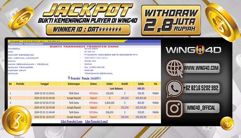 Bukti berikut merupakan salah satu komitmen WING4D untuk melayani seluruh member setia WING4D secara sungguh-sungguh, Dengan membayar Lunas seluruh kemenangan member secara Cepat, Tepat dan Akurat.