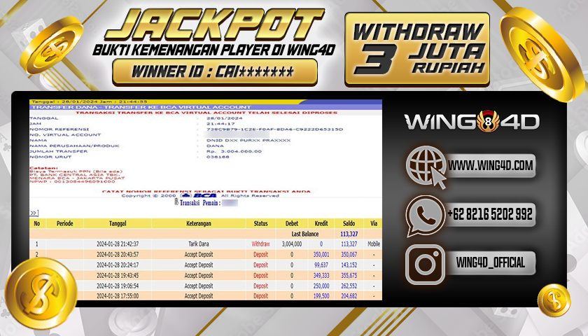 Bukti berikut merupakan salah satu komitmen WING4D untuk melayani seluruh member setia WING4D secara sungguh-sungguh, Dengan membayar Lunas seluruh kemenangan member secara Cepat, Tepat dan Akurat.