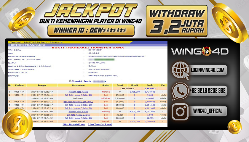Bukti berikut merupakan salah satu komitmen WING4D untuk melayani seluruh member setia WING4D secara sungguh-sungguh, Dengan membayar Lunas seluruh kemenangan member secara Cepat, Tepat dan Akurat.