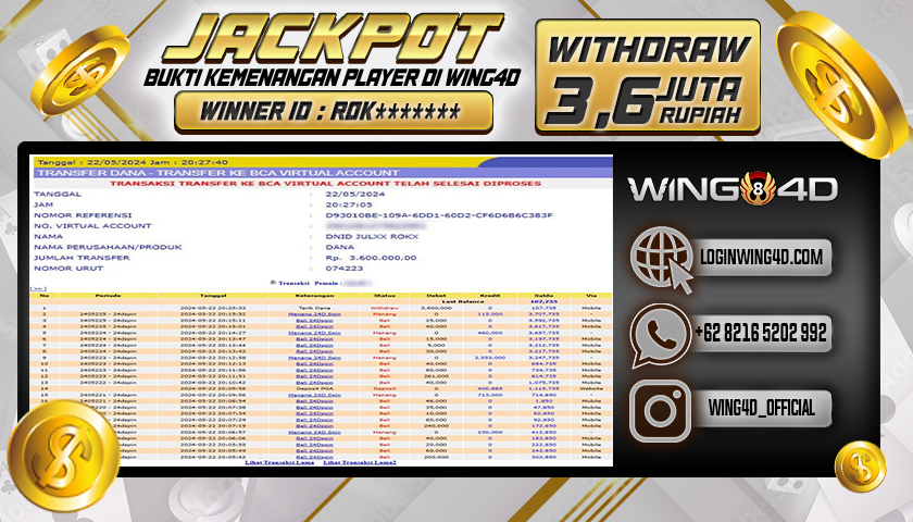 Bukti berikut merupakan salah satu komitmen WING4D untuk melayani seluruh member setia WING4D secara sungguh-sungguh, Dengan membayar Lunas seluruh kemenangan member secara Cepat, Tepat dan Akurat. Selamat kepada Ibu. JULIA ROKI yang akhirnya mendapatkan jackpot besar dalam Permainan Slot : 24Dspin User di situs bandar togel terpercaya WING4D. Dalam WITHDRAW sebesar Rp. 3,600,000,- di bayar dengan lunas dan prosesnya di lakukan secara cepat oleh pihak WING4D. Dengan bukti yang kami berikan sudah seharusnya menjadi hal yang bisa anda semua bayangkan betapa aman dan nyamannya pelayanan yang di berikan WING4Dkepada para membernya. Tentunya jika anda masih bingung mencari situs bandar togel online terpercaya, anda bisa segera melakukan pendaftaran dan bermain di situs togel online terpercaya dan terbukti membayar semua kemenangan jumlah berapapun seperti situs WING4D!. Gabung dengan WING4D banyak PROMO BONUSNYA Dapatkan promo bonus menarik dari WING4D yaitu :