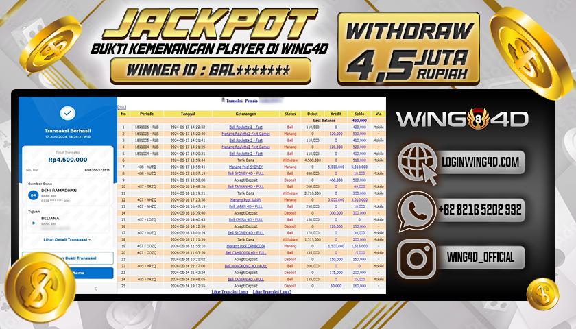 Bukti berikut merupakan salah satu komitmen WING4D untuk melayani seluruh member setia WING4D secara sungguh-sungguh, Dengan membayar Lunas seluruh kemenangan member secara Cepat, Tepat dan Akurat.