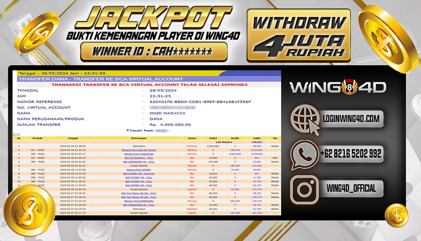 Bukti berikut merupakan salah satu komitmen WING4D untuk melayani seluruh member setia WING4D secara sungguh-sungguh, Dengan membayar Lunas seluruh kemenangan member secara Cepat, Tepat dan Akurat.