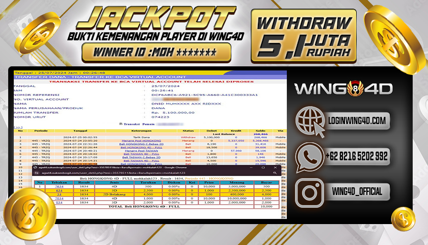 Selamat kepada Bpk. Muhamad Ari Ridwan yang akhirnya mendapatkan jackpot besar dalam PASARAN TOGEL HONGKONG di situs bandar togel terpercaya WING4D. Dalam WITHDRAW sebesar Rp. 5,100,000,- di bayar dengan lunas dan prosesnya di lakukan secara cepat oleh pihak WING4D. Dengan bukti yang kami berikan sudah seharusnya menjadi hal yang bisa anda semua bayangkan betapa aman dan nyamannya pelayanan yang di berikan WING4Dkepada para membernya. Tentunya jika anda masih bingung mencari situs bandar togel online terpercaya, anda bisa segera melakukan pendaftaran dan bermain di situs togel online terpercaya dan terbukti membayar semua kemenangan jumlah berapapun seperti situs WING4D!.