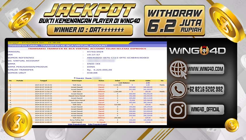 Selamat kepada Bpk. ISA yang akhirnya mendapatkan jackpot besar dalam Permainan Slot : Slot Mania  di situs bandar togel terpercaya WING4D. Dalam WITHDRAW sebesar Rp. 6,220,000,- di bayar dengan lunas dan prosesnya di lakukan secara cepat oleh pihak WING4D. Dengan bukti yang kami berikan sudah seharusnya menjadi hal yang bisa anda semua bayangkan betapa aman dan nyamannya pelayanan yang di berikan WING4Dkepada para membernya. Tentunya jika anda masih bingung mencari situs bandar togel online terpercaya, anda bisa segera melakukan pendaftaran dan bermain di situs togel online terpercaya dan terbukti membayar semua kemenangan jumlah berapapun seperti situs WING4D!.