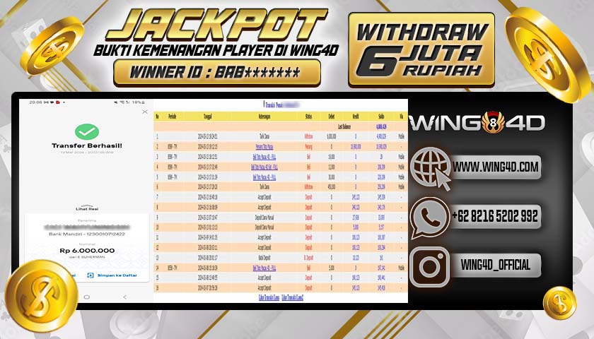 Bukti berikut merupakan salah satu komitmen WING4D untuk melayani seluruh member setia WING4D secara sungguh-sungguh, Dengan membayar Lunas seluruh kemenangan member secara Cepat, Tepat dan Akurat. Selamat kepada Ibu. CICI WAHYUNINGSIH yang akhirnya mendapatkan jackpot besar dalam PASARAN TOGEL TOTO MACAU di situs bandar togel terpercaya WING4D. Dalam WITHDRAW sebesar Rp. 6,000,000,- di bayar dengan lunas dan prosesnya di lakukan secara cepat oleh pihak WING4D. Dengan bukti yang kami berikan sudah seharusnya menjadi hal yang bisa anda semua bayangkan betapa aman dan nyamannya pelayanan yang di berikan WING4Dkepada para membernya. Tentunya jika anda masih bingung mencari situs bandar togel online terpercaya, anda bisa segera melakukan pendaftaran dan bermain di situs togel online terpercaya dan terbukti membayar semua kemenangan jumlah berapapun seperti situs WING4D!. Gabung dengan WING4D banyak PROMO BONUSNYA Dapatkan promo bonus menarik dari WING4D yaitu :