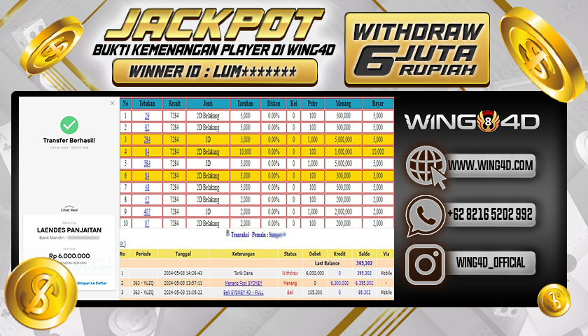 Selamat kepada Bpk. LAENDES PANJAITAN yang akhirnya mendapatkan jackpot besar dalam PASARAN TOGEL SYDNEY di situs bandar togel terpercaya WING4D. Dalam WITHDRAW sebesar Rp. 6,000,000,- di bayar dengan lunas dan prosesnya di lakukan secara cepat oleh pihak WING4D. Dengan bukti yang kami berikan sudah seharusnya menjadi hal yang bisa anda semua bayangkan betapa aman dan nyamannya pelayanan yang di berikan WING4Dkepada para membernya. Tentunya jika anda masih bingung mencari situs bandar togel online terpercaya, anda bisa segera melakukan pendaftaran dan bermain di situs togel online terpercaya dan terbukti membayar semua kemenangan jumlah berapapun seperti situs WING4D!.