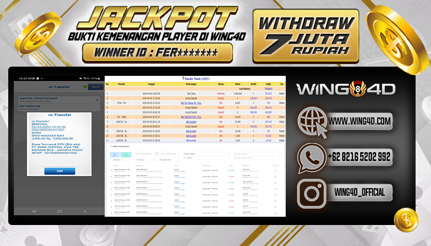 Bukti berikut merupakan salah satu komitmen WING4D untuk melayani seluruh member setia WING4D secara sungguh-sungguh, Dengan membayar Lunas seluruh kemenangan member secara Cepat, Tepat dan Akurat. Selamat kepada Bpk. IMANUEL RAHMAT yang akhirnya mendapatkan jackpot besar dalam Permainan Slot : Gates Of Olympus di situs bandar togel terpercaya WING4D. Dalam WITHDRAW sebesar Rp. 7,00,000,- di bayar dengan lunas dan prosesnya di lakukan secara cepat oleh pihak WING4D. Dengan bukti yang kami berikan sudah seharusnya menjadi hal yang bisa anda semua bayangkan betapa aman dan nyamannya pelayanan yang di berikan WING4Dkepada para membernya. Tentunya jika anda masih bingung mencari situs bandar togel online terpercaya, anda bisa segera melakukan pendaftaran dan bermain di situs togel online terpercaya dan terbukti membayar semua kemenangan jumlah berapapun seperti situs WING4D!. Gabung dengan WING4D banyak PROMO BONUSNYA Dapatkan promo bonus menarik dari WING4D yaitu :