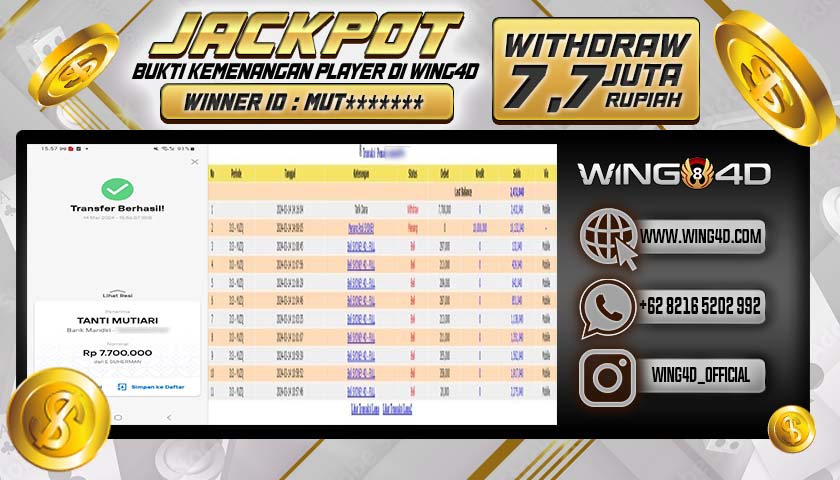 Selamat kepada Ibu. TANTI MUTIARA yang akhirnya mendapatkan jackpot besar dalam PASARAN TOGEL SYDNEY di situs bandar togel terpercaya WING4D. Dalam WITHDRAW sebesar Rp. 7,700,000,- di bayar dengan lunas dan prosesnya di lakukan secara cepat oleh pihak WING4D. Dengan bukti yang kami berikan sudah seharusnya menjadi hal yang bisa anda semua bayangkan betapa aman dan nyamannya pelayanan yang di berikan WING4Dkepada para membernya. Tentunya jika anda masih bingung mencari situs bandar togel online terpercaya, anda bisa segera melakukan pendaftaran dan bermain di situs togel online terpercaya dan terbukti membayar semua kemenangan jumlah berapapun seperti situs WING4D!.