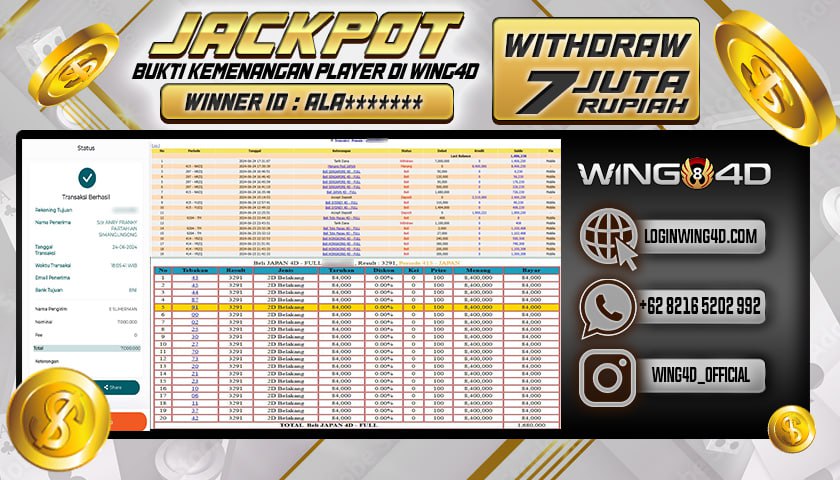 Bukti berikut merupakan salah satu komitmen WING4D untuk melayani seluruh member setia WING4D secara sungguh-sungguh, Dengan membayar Lunas seluruh kemenangan member secara Cepat, Tepat dan Akurat. Selamat kepada Bpk. ANRY FRANKY PARTAHIAN yang akhirnya mendapatkan jackpot besar dalam PASARAN TOGEL JAPAN di situs bandar togel terpercaya WING4D. Dalam WITHDRAW sebesar Rp. 7,000,000,- di bayar dengan lunas dan prosesnya di lakukan secara cepat oleh pihak WING4D. Dengan bukti yang kami berikan sudah seharusnya menjadi hal yang bisa anda semua bayangkan betapa aman dan nyamannya pelayanan yang di berikan WING4Dkepada para membernya. Tentunya jika anda masih bingung mencari situs bandar togel online terpercaya, anda bisa segera melakukan pendaftaran dan bermain di situs togel online terpercaya dan terbukti membayar semua kemenangan jumlah berapapun seperti situs WING4D!. Gabung dengan WING4D banyak PROMO BONUSNYA Dapatkan promo bonus menarik dari WING4D yaitu :