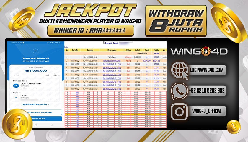 Bukti berikut merupakan salah satu komitmen WING4D untuk melayani seluruh member setia WING4D secara sungguh-sungguh, Dengan membayar Lunas seluruh kemenangan member secara Cepat, Tepat dan Akurat. Selamat kepada Bpk. VICKY yang akhirnya mendapatkan jackpot besar dalam Pasaran Togel HONGKONG di situs bandar togel terpercaya WING4D. Dalam WITHDRAW sebesar Rp. 8,000,000,- di bayar dengan lunas dan prosesnya di lakukan secara cepat oleh pihak WING4D. Dengan bukti yang kami berikan sudah seharusnya menjadi hal yang bisa anda semua bayangkan betapa aman dan nyamannya pelayanan yang di berikan WING4Dkepada para membernya. Tentunya jika anda masih bingung mencari situs bandar togel online terpercaya, anda bisa segera melakukan pendaftaran dan bermain di situs togel online terpercaya dan terbukti membayar semua kemenangan jumlah berapapun seperti situs WING4D!. Gabung dengan WING4D banyak PROMO BONUSNYA Dapatkan promo bonus menarik dari WING4D yaitu :