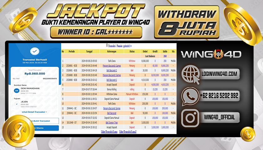 Bukti berikut merupakan salah satu komitmen WING4D untuk melayani seluruh member setia WING4D secara sungguh-sungguh, Dengan membayar Lunas seluruh kemenangan member secara Cepat, Tepat dan Akurat. Selamat kepada Bpk. JEJEN yang akhirnya mendapatkan jackpot besar dalam Permainan Live Game : Baccarat 2 Games di situs bandar togel terpercaya WING4D. Dalam WITHDRAW sebesar Rp. 8,000,000,- di bayar dengan lunas dan prosesnya di lakukan secara cepat oleh pihak WING4D. Dengan bukti yang kami berikan sudah seharusnya menjadi hal yang bisa anda semua bayangkan betapa aman dan nyamannya pelayanan yang di berikan WING4Dkepada para membernya. Tentunya jika anda masih bingung mencari situs bandar togel online terpercaya, anda bisa segera melakukan pendaftaran dan bermain di situs togel online terpercaya dan terbukti membayar semua kemenangan jumlah berapapun seperti situs WING4D!. Gabung dengan WING4D banyak PROMO BONUSNYA Dapatkan promo bonus menarik dari WING4D yaitu :