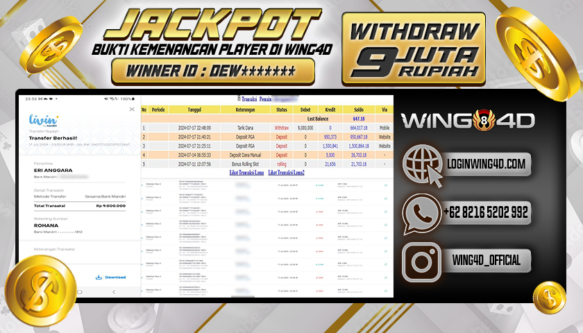 Selamat kepada Bpk. ERI ANGGARA yang akhirnya mendapatkan jackpot besar dalam Permainan Slot : Mahjong Ways 2 di situs bandar togel terpercaya WING4D. Dalam WITHDRAW sebesar Rp. 9,000,000,- di bayar dengan lunas dan prosesnya di lakukan secara cepat oleh pihak WING4D. Dengan bukti yang kami berikan sudah seharusnya menjadi hal yang bisa anda semua bayangkan betapa aman dan nyamannya pelayanan yang di berikan WING4Dkepada para membernya. Tentunya jika anda masih bingung mencari situs bandar togel online terpercaya, anda bisa segera melakukan pendaftaran dan bermain di situs togel online terpercaya dan terbukti membayar semua kemenangan jumlah berapapun seperti situs WING4D!.