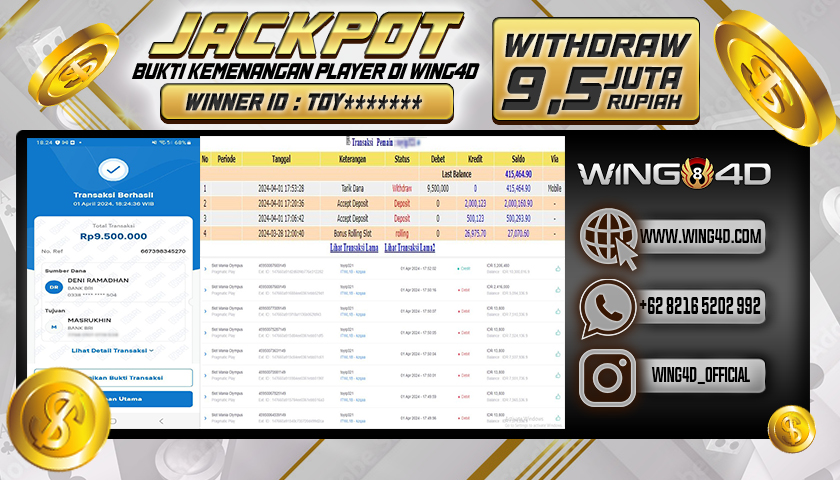 Selamat kepada Bpk. MASRUKHIN yang akhirnya mendapatkan jackpot besar dalam Permainan Slot : Slot Mania Olympus di situs bandar togel terpercaya WING4D. Dalam WITHDRAW sebesar Rp. 9,500,000,- di bayar dengan lunas dan prosesnya di lakukan secara cepat oleh pihak WING4D. Dengan bukti yang kami berikan sudah seharusnya menjadi hal yang bisa anda semua bayangkan betapa aman dan nyamannya pelayanan yang di berikan WING4Dkepada para membernya. Tentunya jika anda masih bingung mencari situs bandar togel online terpercaya, anda bisa segera melakukan pendaftaran dan bermain di situs togel online terpercaya dan terbukti membayar semua kemenangan jumlah berapapun seperti situs WING4D!.