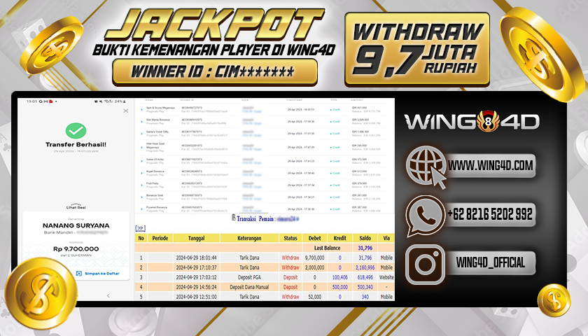 Selamat kepada Bpk. NANANG SURYANA yang akhirnya mendapatkan jackpot besar dalam Permainan Slot : Progmatic Play di situs bandar togel terpercaya WING4D. Dalam WITHDRAW sebesar Rp. 9,700,000,- di bayar dengan lunas dan prosesnya di lakukan secara cepat oleh pihak WING4D. Dengan bukti yang kami berikan sudah seharusnya menjadi hal yang bisa anda semua bayangkan betapa aman dan nyamannya pelayanan yang di berikan WING4Dkepada para membernya. Tentunya jika anda masih bingung mencari situs bandar togel online terpercaya, anda bisa segera melakukan pendaftaran dan bermain di situs togel online terpercaya dan terbukti membayar semua kemenangan jumlah berapapun seperti situs WING4D!.
